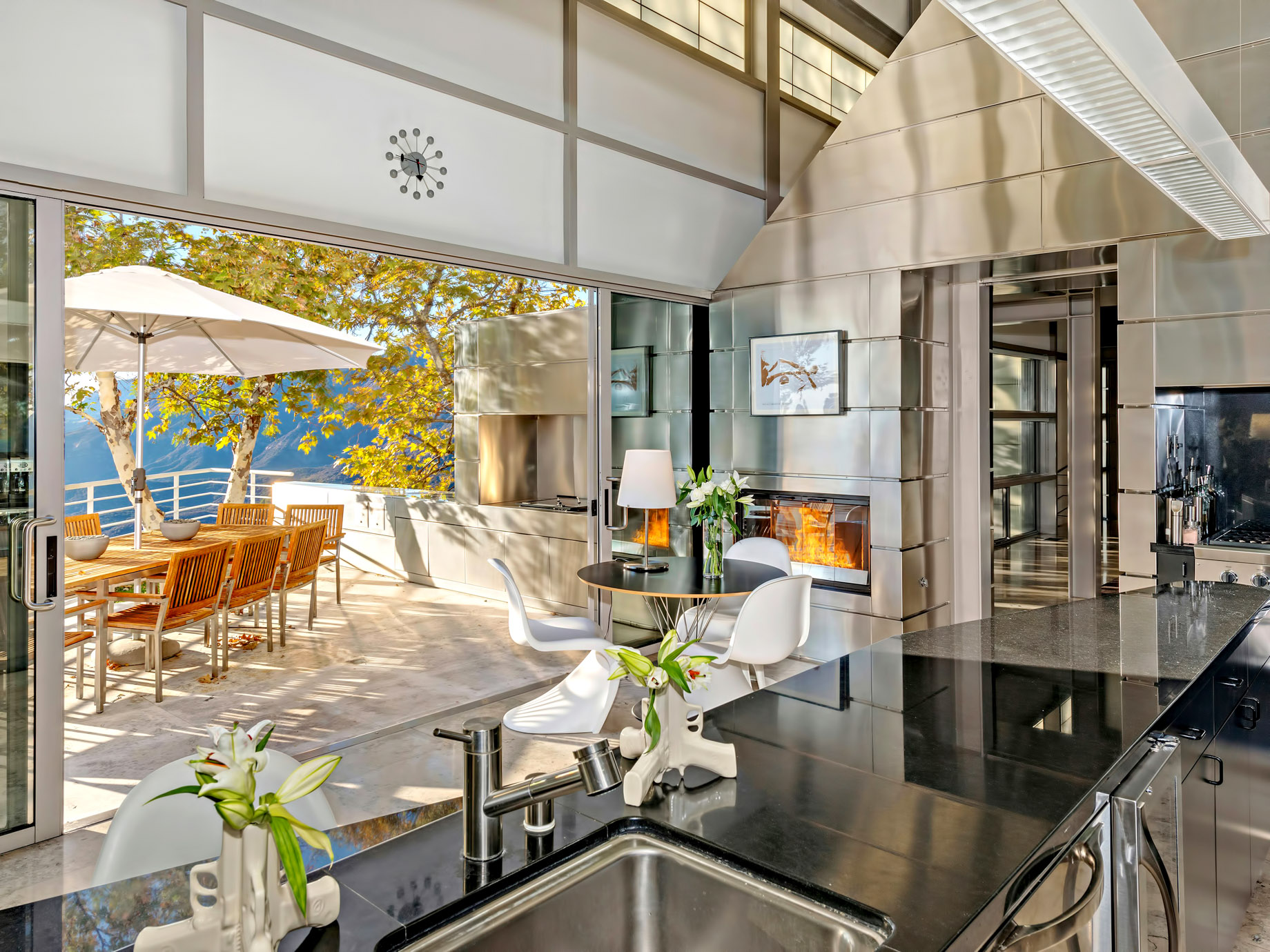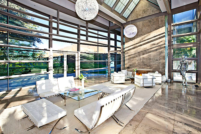 Gorgeous architectural hilltop estate with sleek likes, beautiful yard with pool.